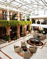 The hotel's marble-clad lobby reflects is furnished with tropical flora